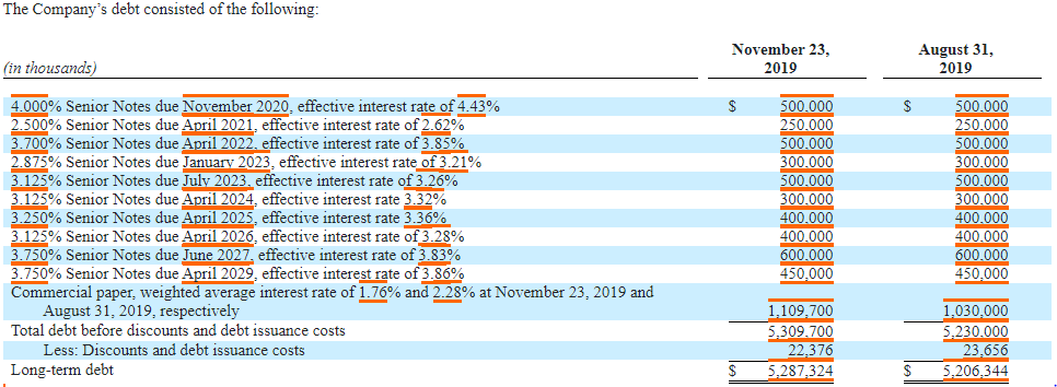 AutoZone (AZO) – It has the most debt. Current liabilities and long-term debt interest piling up, until it will be unbearable: